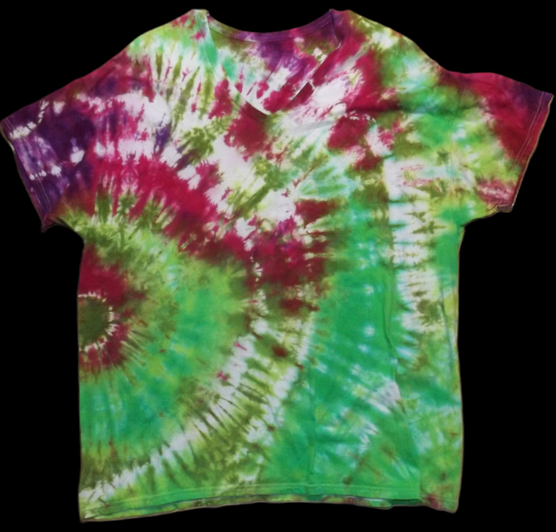 This is a unisex, adult 2X, Fruit of the Loom brand, V-neck, short sleeved, 100 % cotton, psychedelic pattern dyed by hand, tie dye t-shirt which was pre-washed for shrinkage.